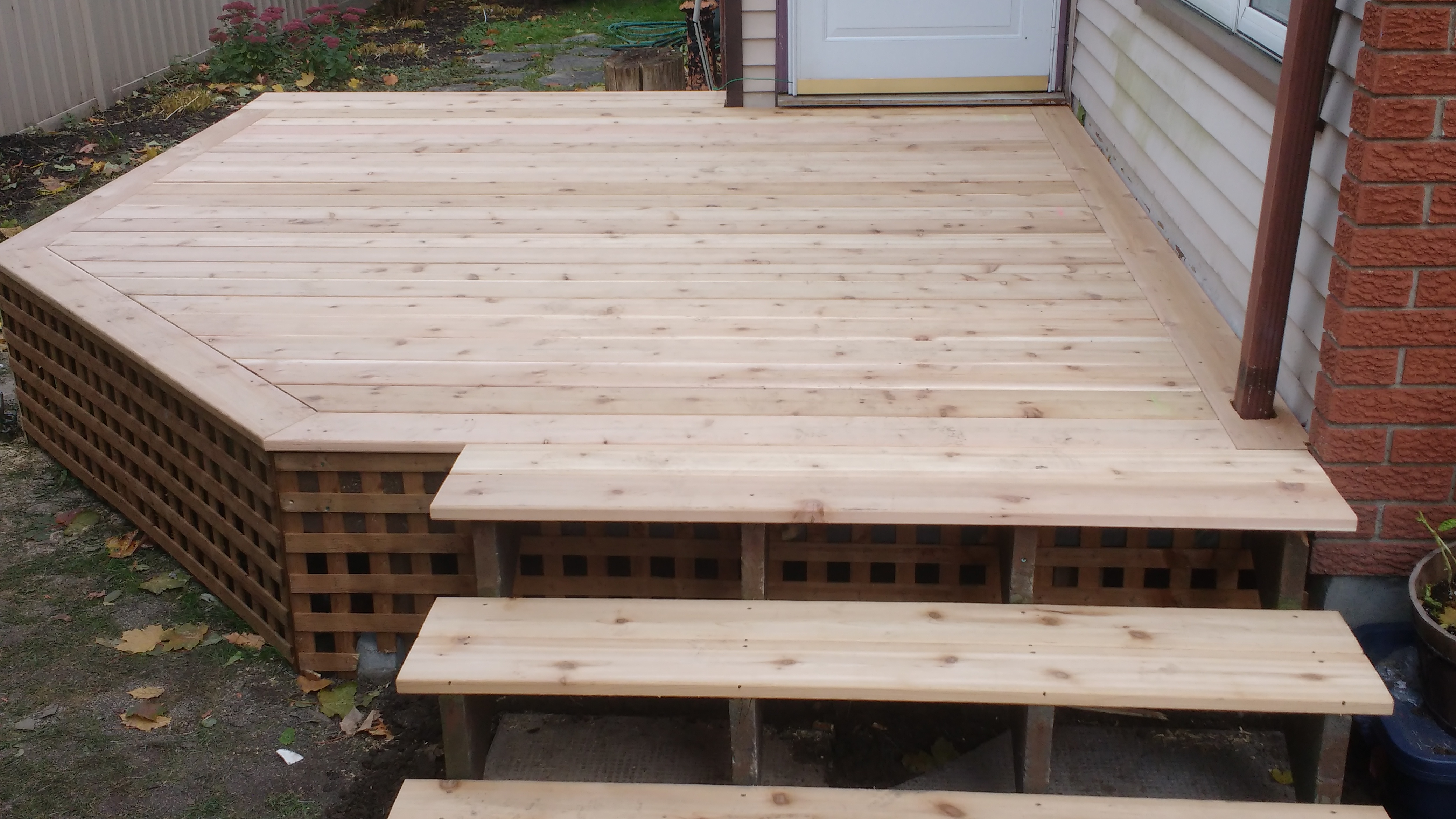 Probably a 20 year-old deck, several deck blocks had either crumbled to nothing or sunk into the ground. Re-instated all (some new) dek-blocks and the 4x4 post supports, added some joists since we were moving to 5/4" cedar instead of 2x6 pt; and added the lattice skirt so the dog doesn't get stuck underneath the deck!